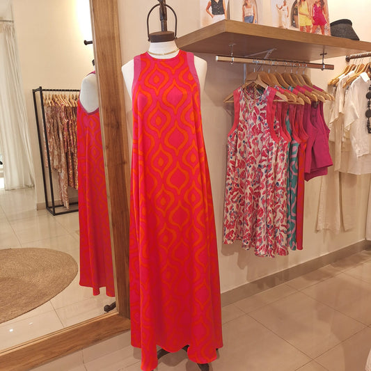 Vestido Mariluz largo seda fucsia y coral